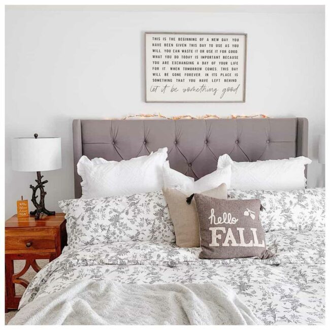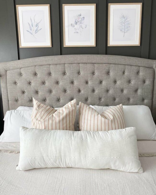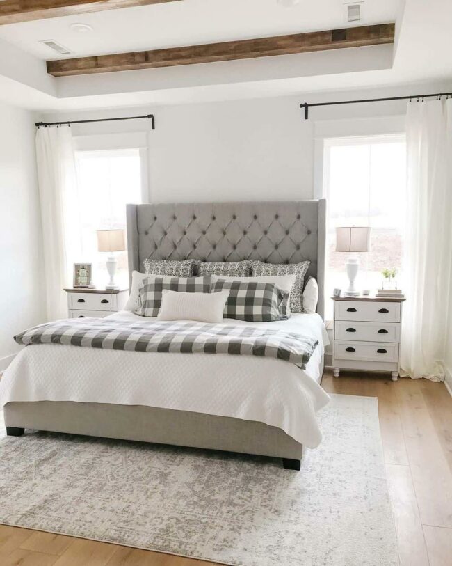Bold gray wingback headboard anchors this farmhouse bedroom with dramatic flair, capturing immediate attention from anyone who enters.
