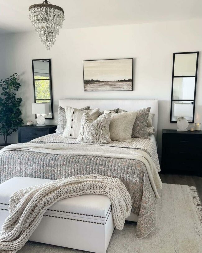 Neutral bedrooms gain instant warmth and personality through strategic accent pieces like this versatile blanket.