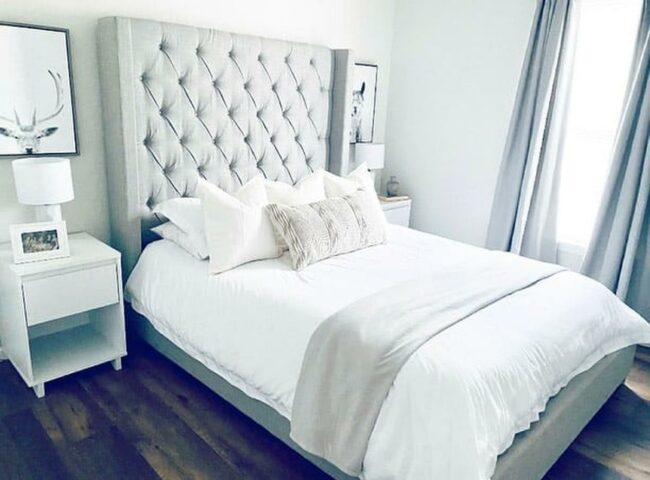 Creamy white walls embrace a calm bedroom, setting a gentle stage for a sophisticated gray bedframe that anchors the space.