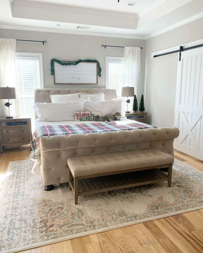Greige walls provide a calm canvas that whispers rustic elegance in your farmhouse bedroom, harmonizing warm and cool tones with understated grace.