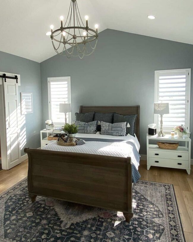 Walnut bedframe anchors this blue-gray bedroom between shuttered windows, creating a serene sanctuary that beckons relaxation.