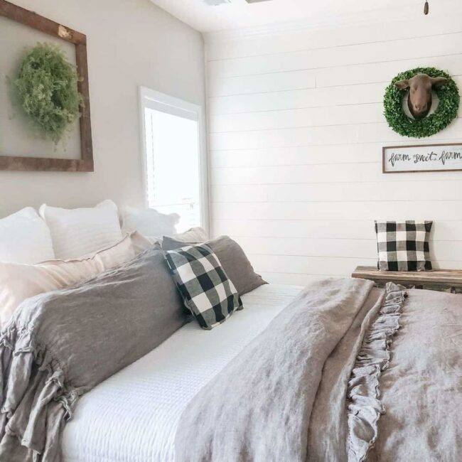 Gray shiplap walls bring an unexpected elegance to bedroom design, instantly upgrading the classic farmhouse aesthetic.