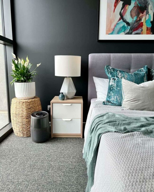 Gray walls set a calm mood, letting teal accents burst with energy and life.