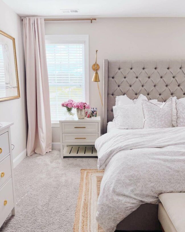 Gold accents elevate this bedroom's romantic atmosphere, creating a luxurious sanctuary where blush and gray tones dance together seamlessly.