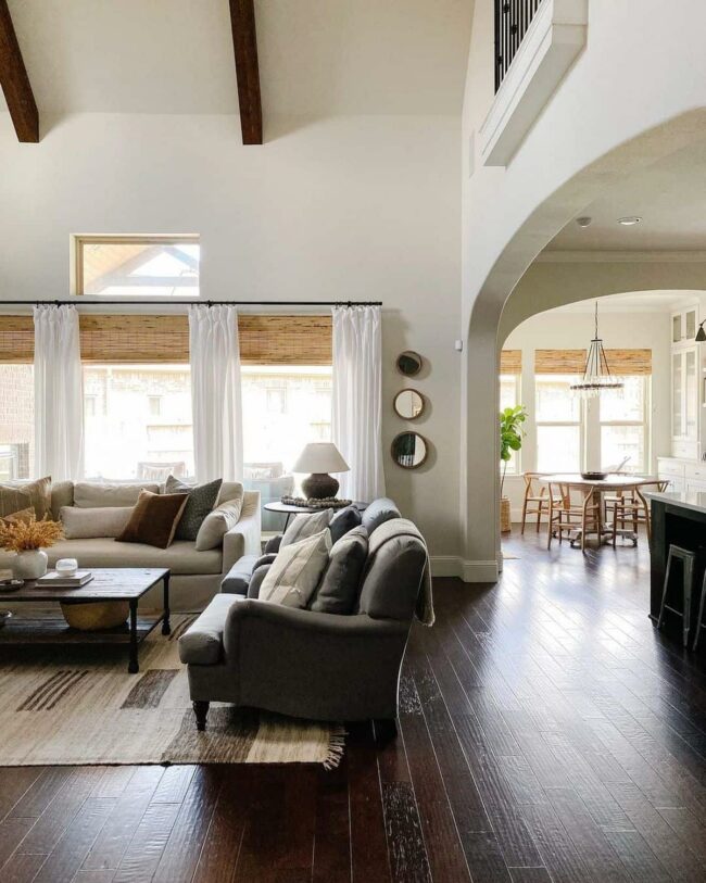 Sophisticated dark wood flooring effortlessly connects living spaces, establishing an elegant home environment.
