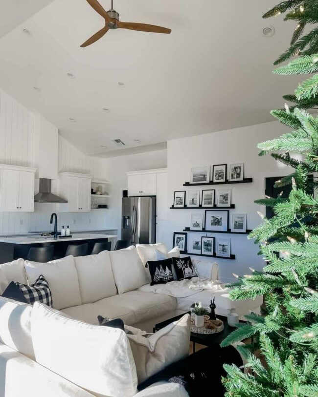 Holiday spirit bursts through this kitchen and living room fusion, where a gray sectional draped with Christmas pillows beckons you to unwind.