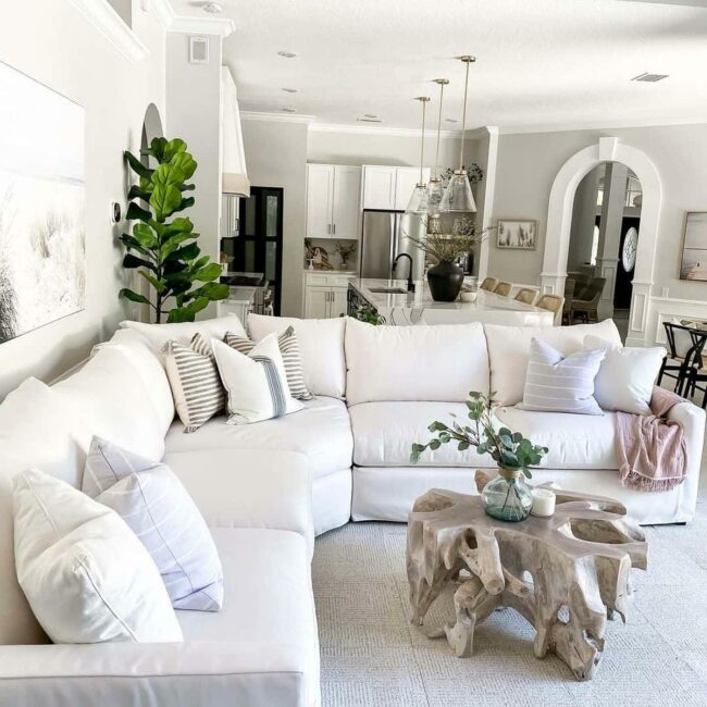 Luxurious white sectional curves around a sophisticated wood coffee table, creating an inviting focal point.