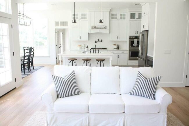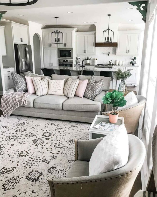 White columns expertly divide the kitchen and living room, masterfully merging modern design with farmhouse charm.
