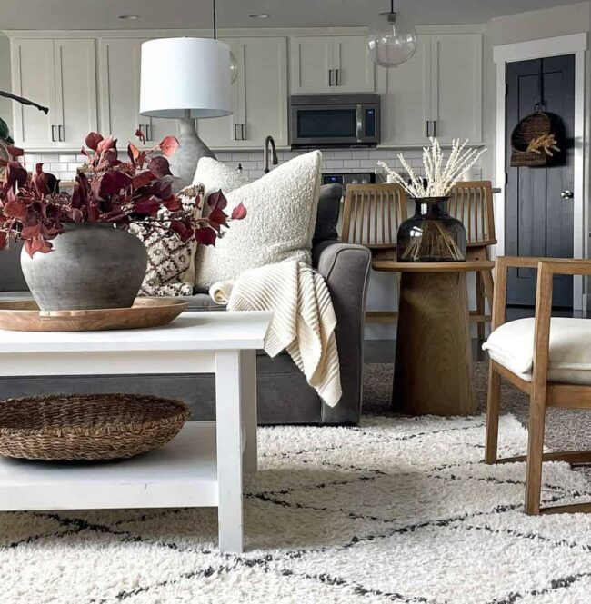 Dark wood drum coffee table anchors the space with rustic charm, nestled on a vintage gray farmhouse rug that weaves subtle texture throughout.
