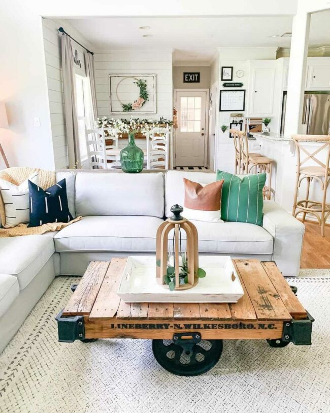 Rustic wooden coffee tables on wheels anchor the living room's heart, drawing eyes with effortless character.