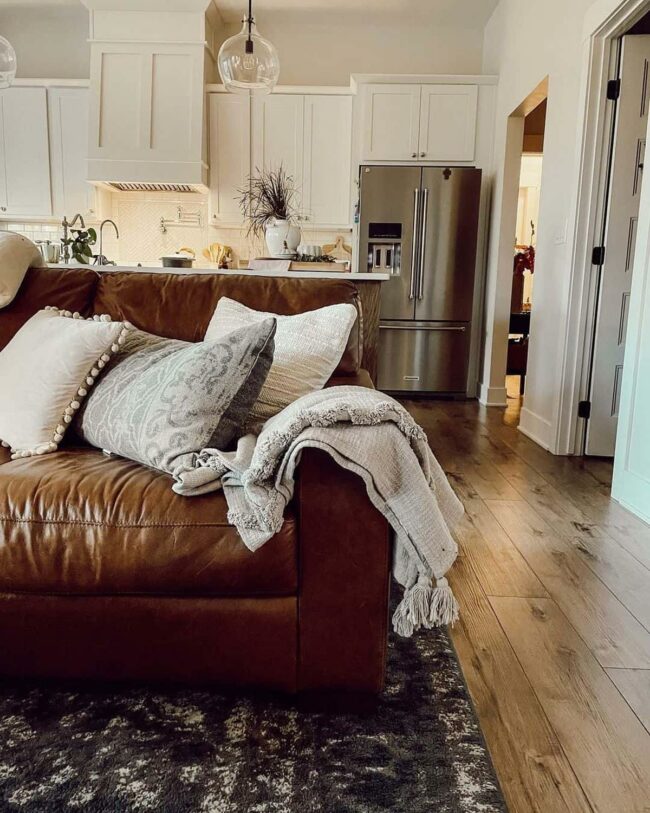 Rustic wood floors sweep through the living room and kitchen, creating a warm, connected space that feels both modern and inviting.