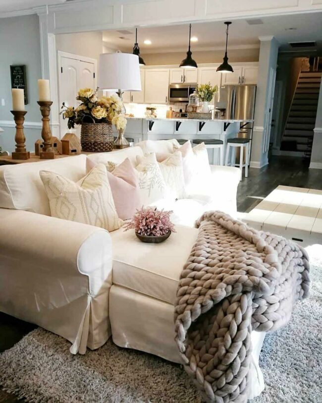 Colorful throw pillows accent a pristine white sectional, adding personality and warmth to the room.