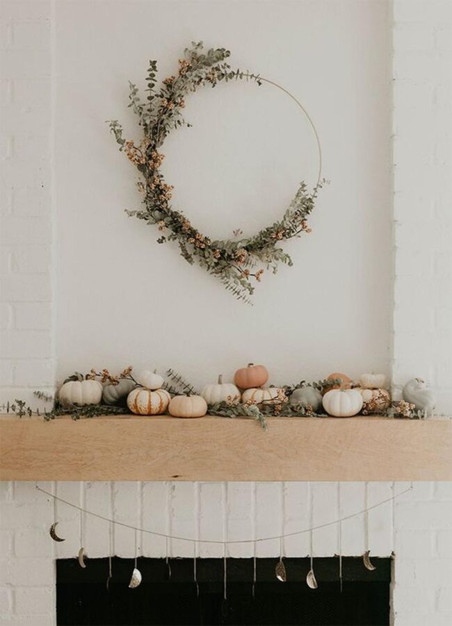 Overhead, a round wreath adorned with lush greenery and scattered berries anchors the entire arrangement, beckoning you to pause and soak in autumn's quiet elegance.