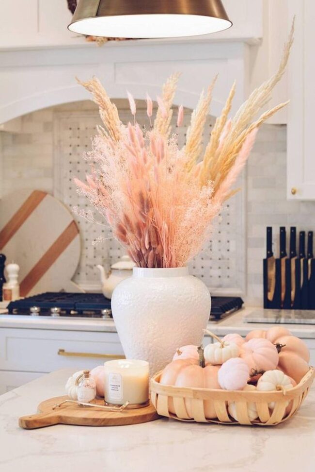 Soft pink and beige dried flowers burst from a pristine white vase, adding gentle charm to kitchen focal points.
