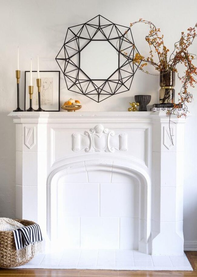 Dramatic black fireplace edges contrast brilliantly with lighter surrounding elements, making each decorative piece pop with visual excitement.