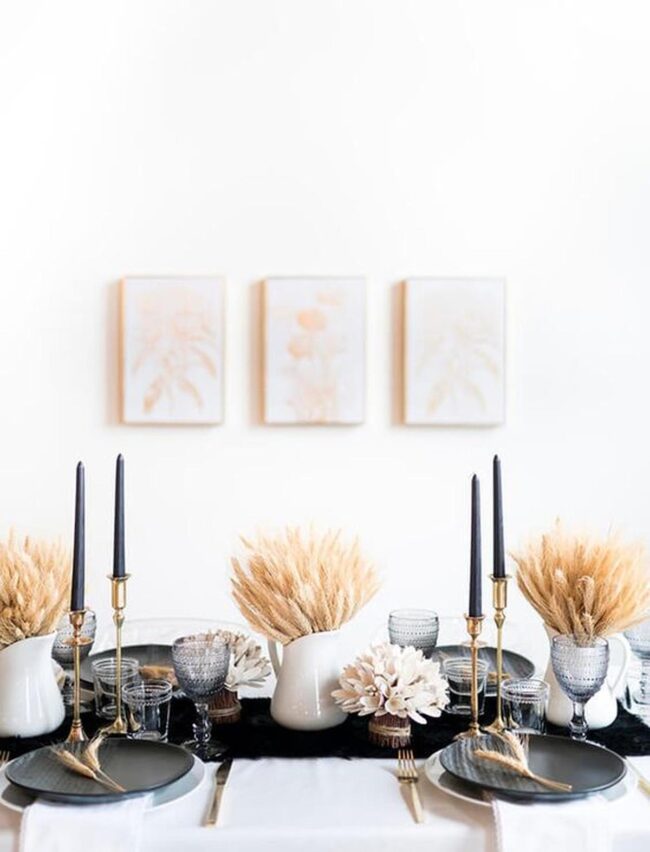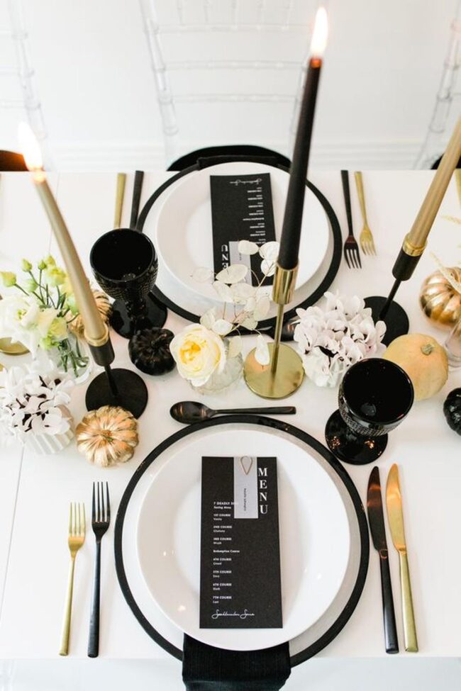 Your dining table becomes a mesmerizing canvas of chic sophistication with a striking black, white, and gold palette that whispers luxury.