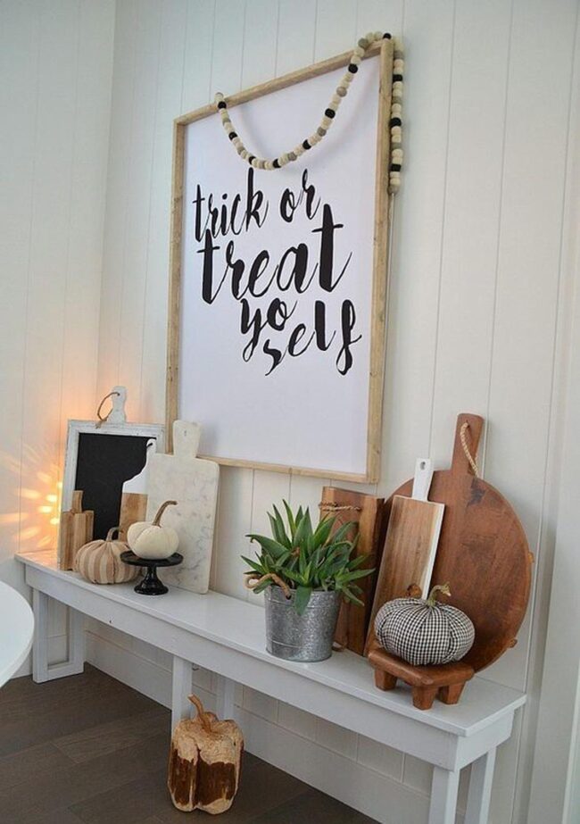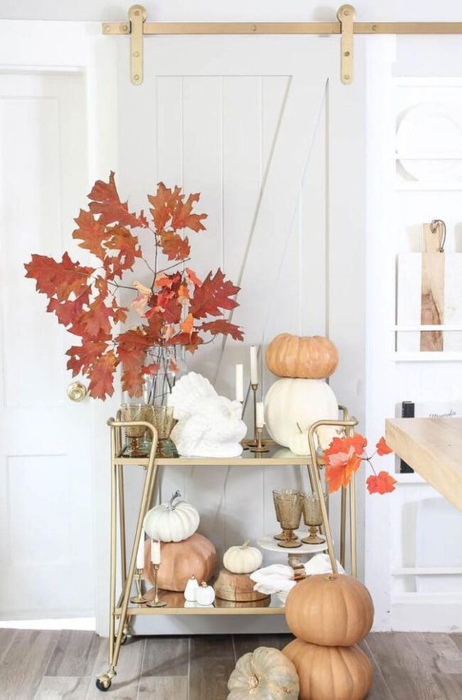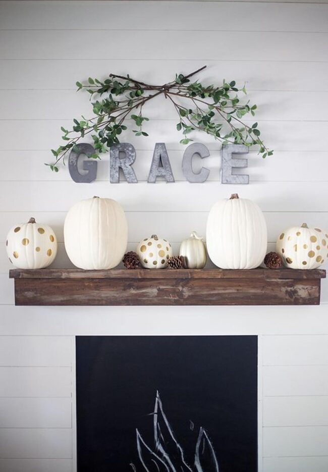 White walls become magical backdrops for seasonal magic when you sprinkle soft orange pumpkins and shimmering gold accents around your rooms.