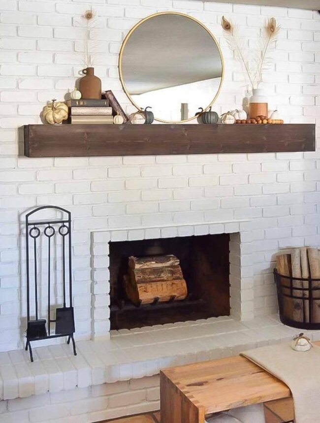 Designing a fireplace sanctuary starts with pristine white brick walls that whisper calm sophistication.