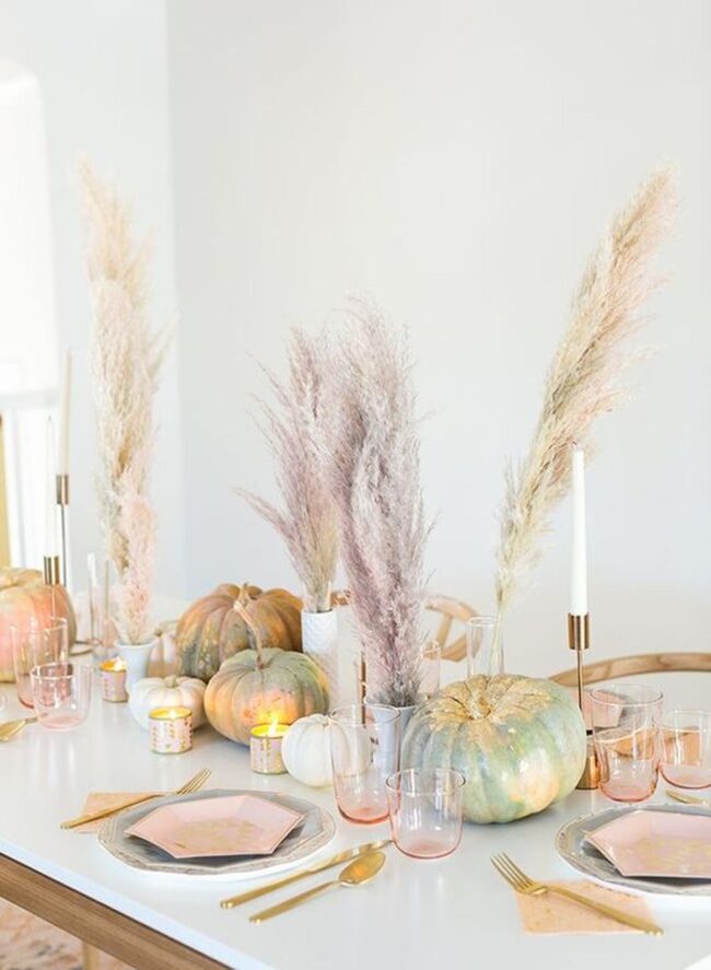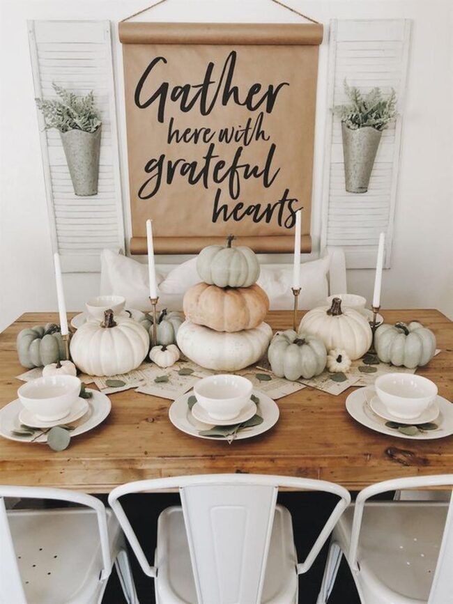 Seasonal touches like white pumpkins nestled among green leaves bring playful energy to your dining area without feeling forced or overdone.