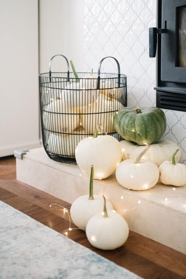 Delicate white and green pumpkins scatter around the space, promising quiet charm and seasonal magic.