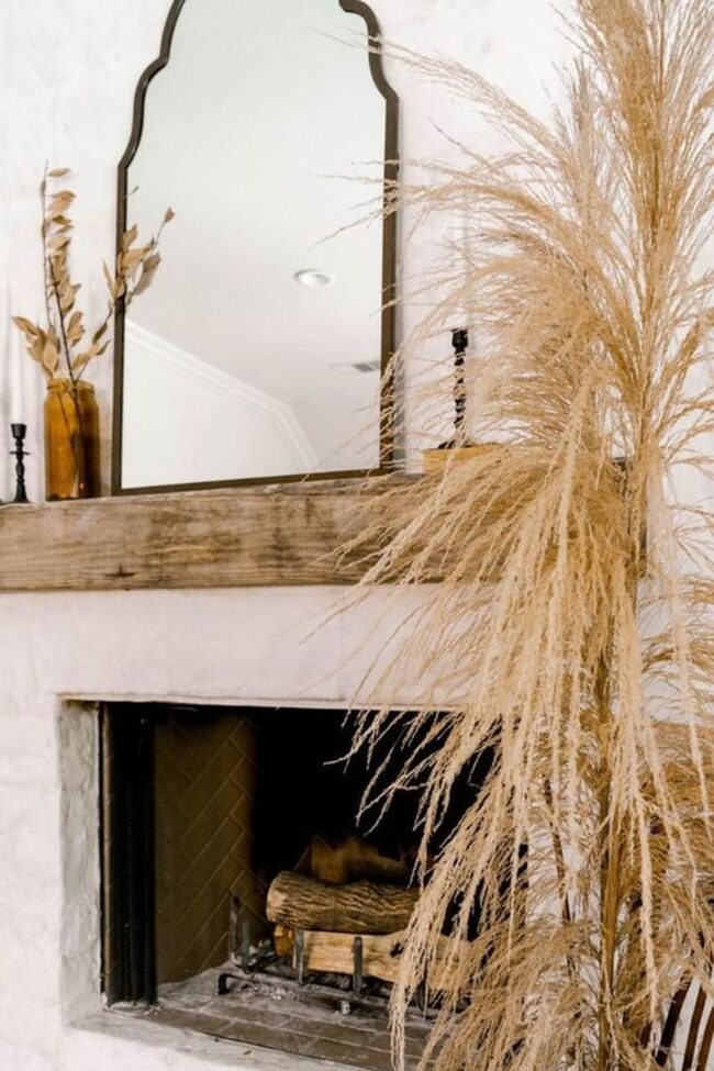 Delicate pink and beige dried grasses perched atop the mantel add subtle visual softness and intrigue.