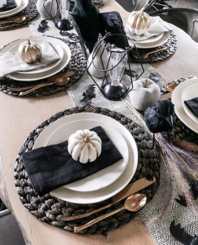 Dark woven placemats root your design with earthy charm, while crisp white plates dance against midnight black napkins adorned with elegant white pumpkins.
