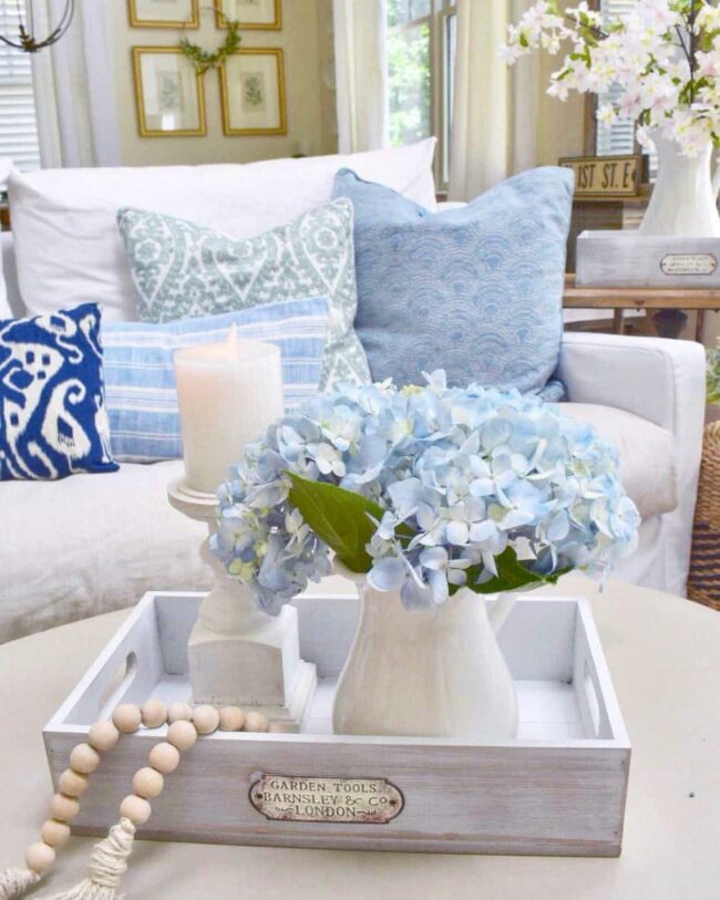 White pillows accent a comfy couch beside an elegant ottoman displaying a charming wooden tray adorned with delicate blue flowers and a classic candlestick.