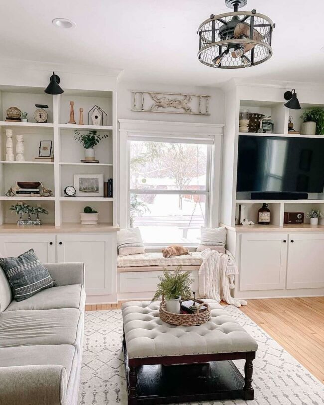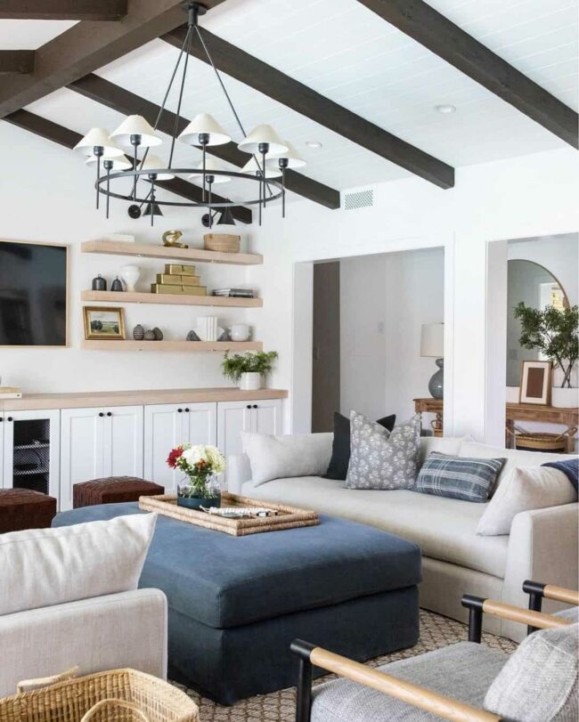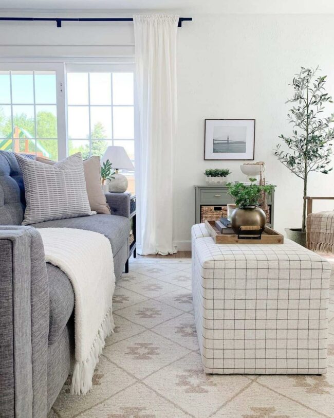 Spacious living rooms come alive with strategic design choices like a grey rectangular ottoman that anchors the space.