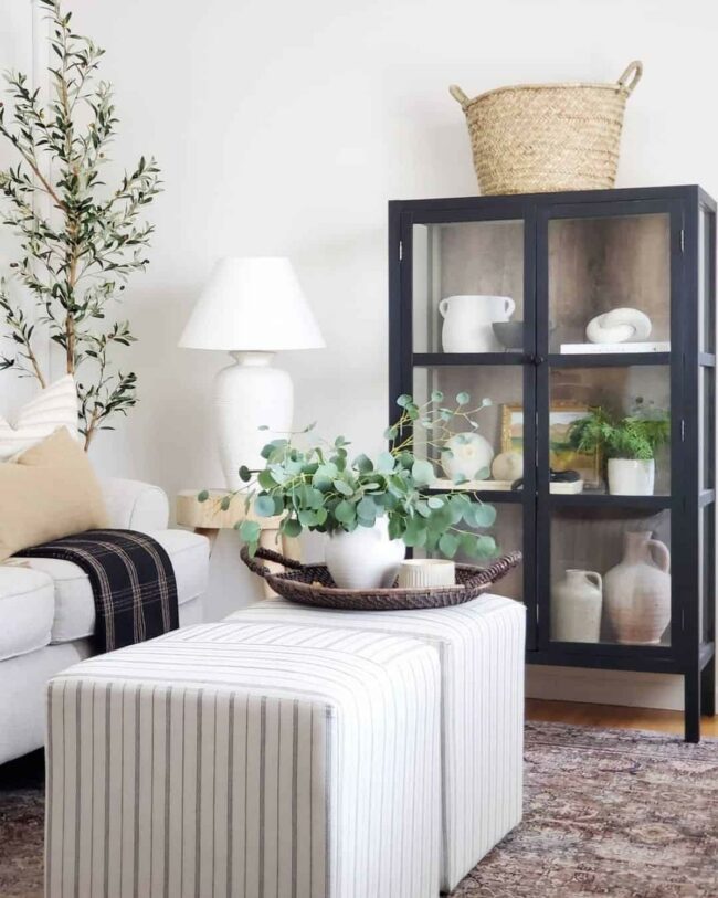 Modern living rooms shine with carefully chosen details like this cube ottoman topped with a wooden tray holding small containers and a charming plant.