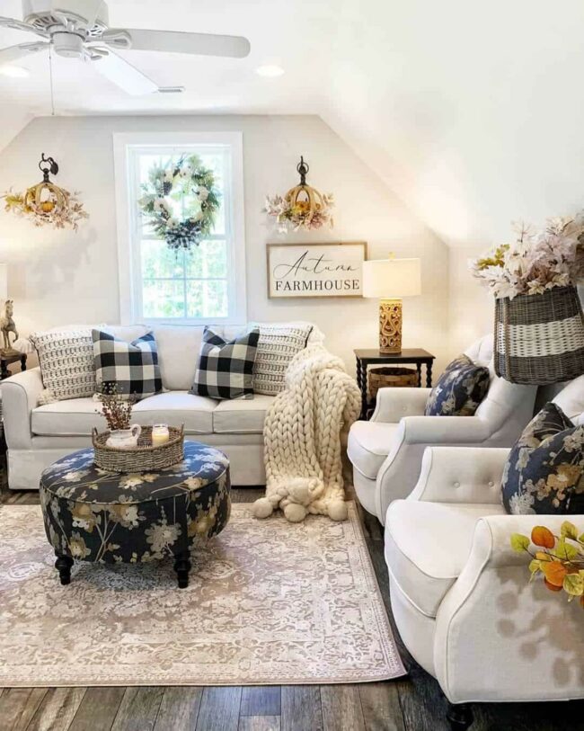 Plaid ottoman centerpieces anchor this warm farmhouse living room, drawing eyes with rustic charm.