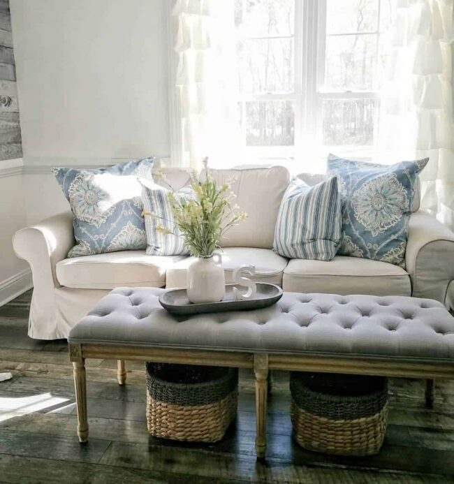 Round rope tray perched on a light blue ottoman anchors this charming living room with effortless style.