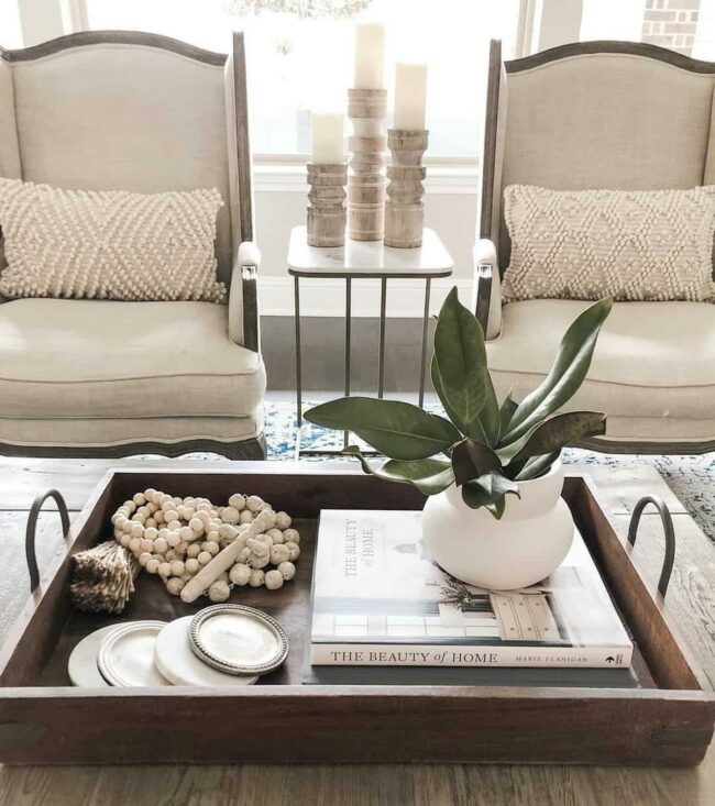Natural tones of a wooden tray complement the relaxed decor, anchoring the space with understated elegance.
