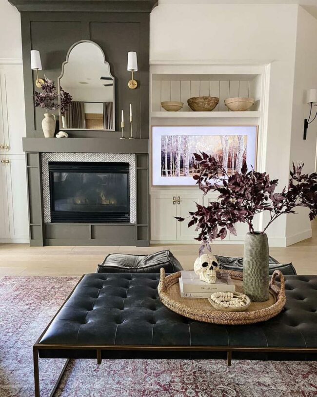 Warm firelight dances across a grey ottoman, instantly drawing you into this inviting living room.
