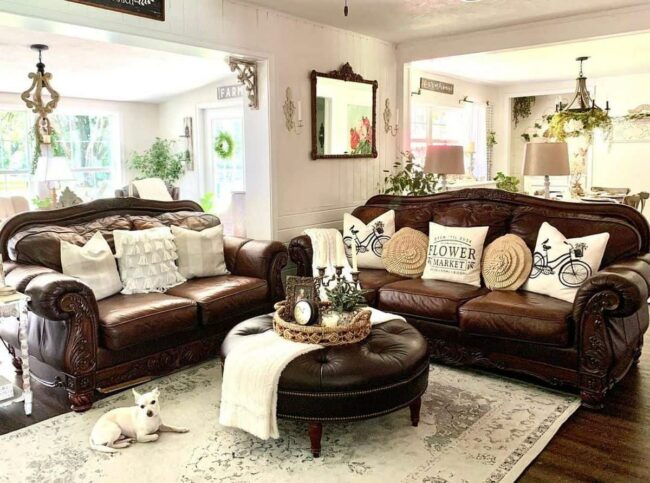 Brown leather couches anchor this farmhouse-inspired living room with their classic charm and robust dark wood frames.