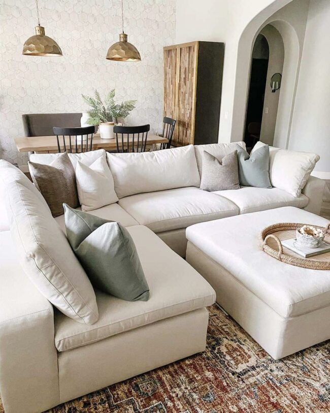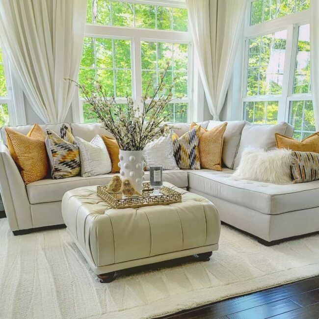 Gold and white throw pillows adorn the sectional sofa, adding warmth and visual balance to the space.