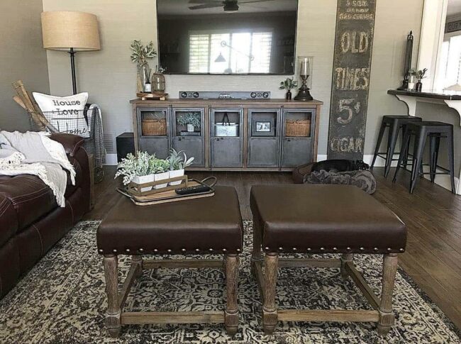 Leather ottomans in deep brown anchor this family room with effortless elegance, complemented by a matching dark area rug that grounds the entire space.