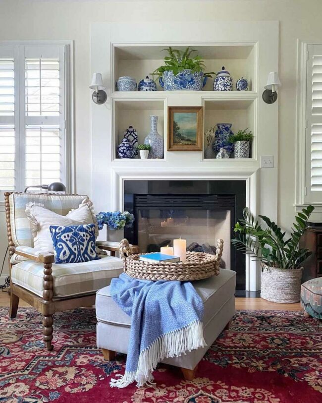 Blue and white throw pillows on the nearby sofa create a harmonious connection with the central piece.