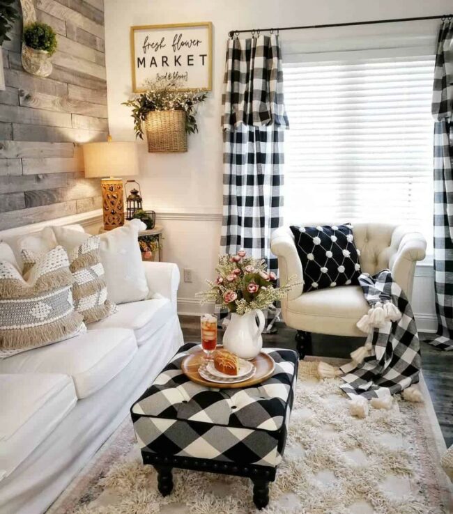 Black plaid curtains frame large windows, creating an inviting atmosphere that feels instantly comfortable.
