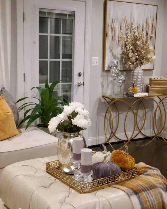 Sunlight cascades across an inviting ottoman adorned with a decorative metal tray showcasing seasonal delights like charming pumpkins and an elegant white floral arrangement.