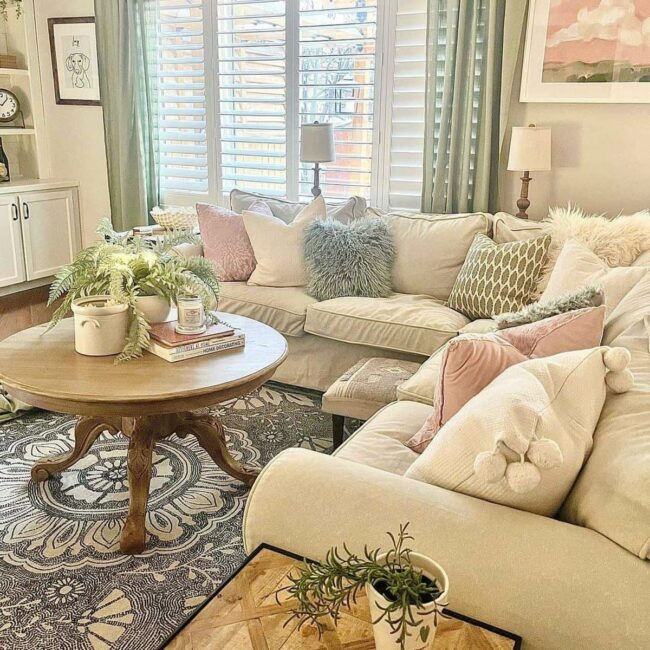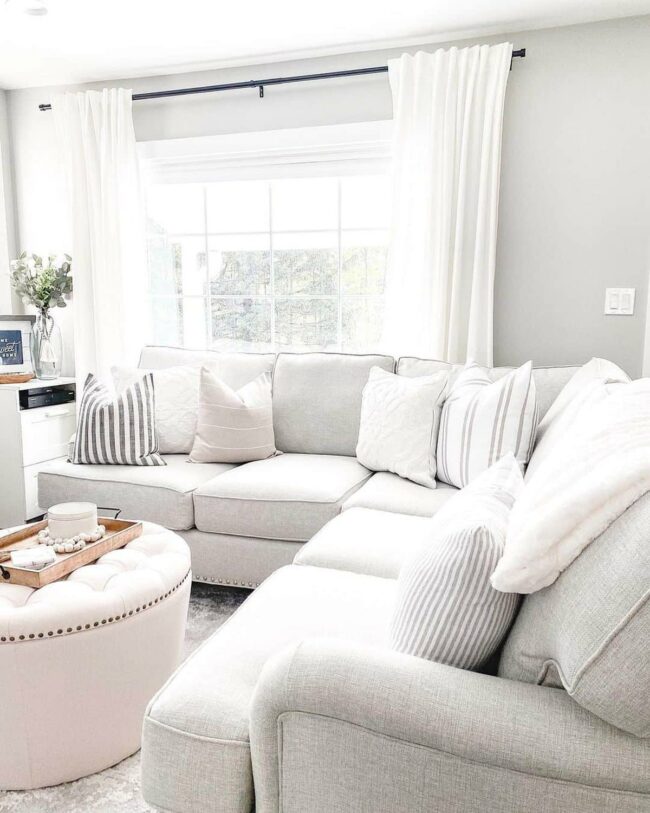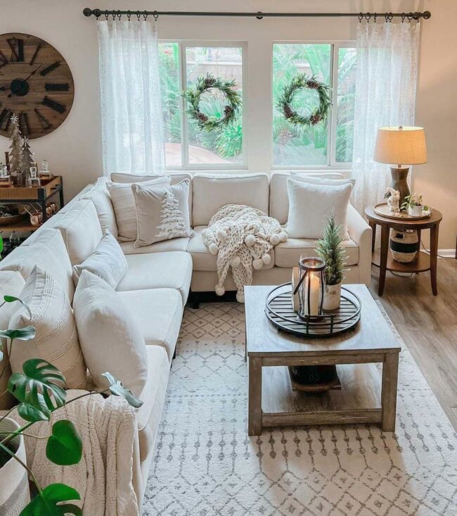 Sunlight dances through white-framed windows, highlighting an elegant ivory L-shaped sectional sofa that anchors the room's welcoming design.