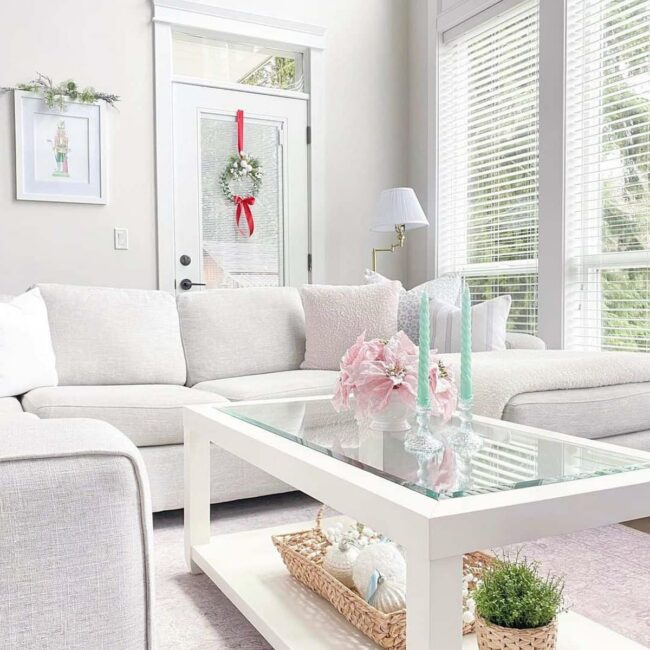 Pink flowers burst with color atop the rectangular white glass-top coffee table.