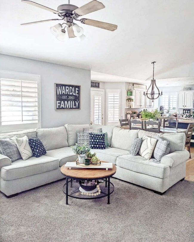 Farmhouse design reaches new heights with a small gray sectional couch that radiates modern comfort and style.