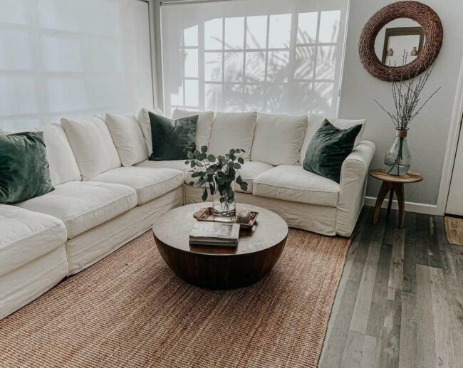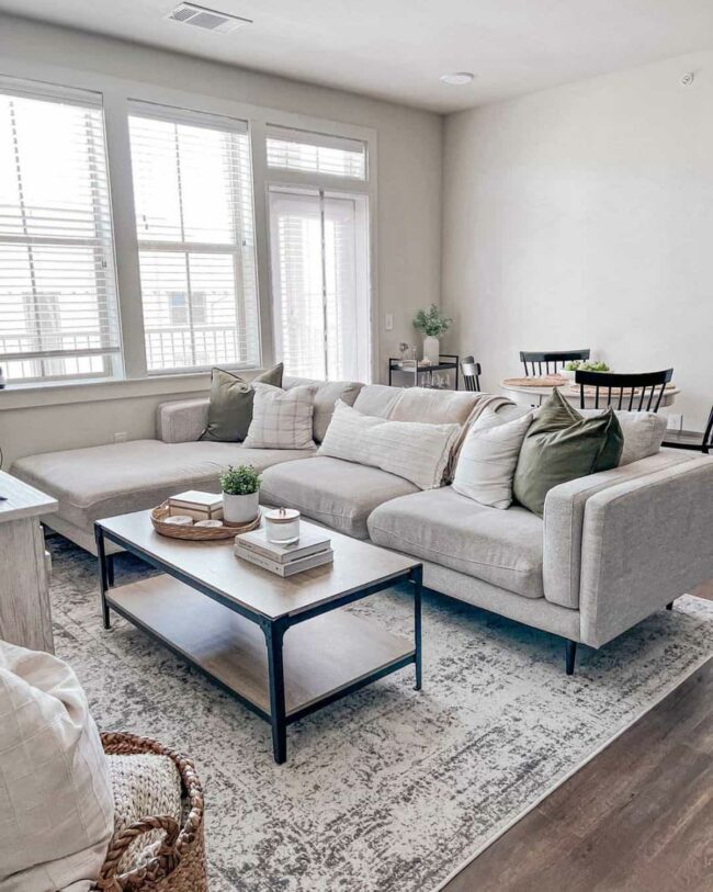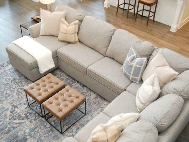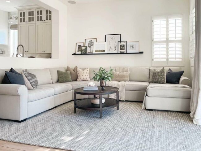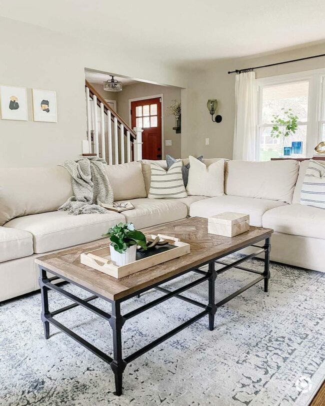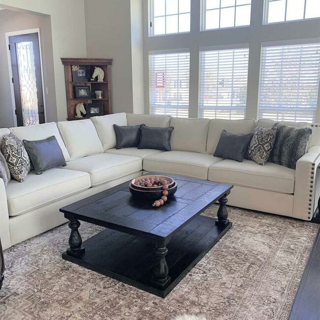 Vintage white and gray rugs complement the sectional's neutral palette, creating visual balance and depth.
