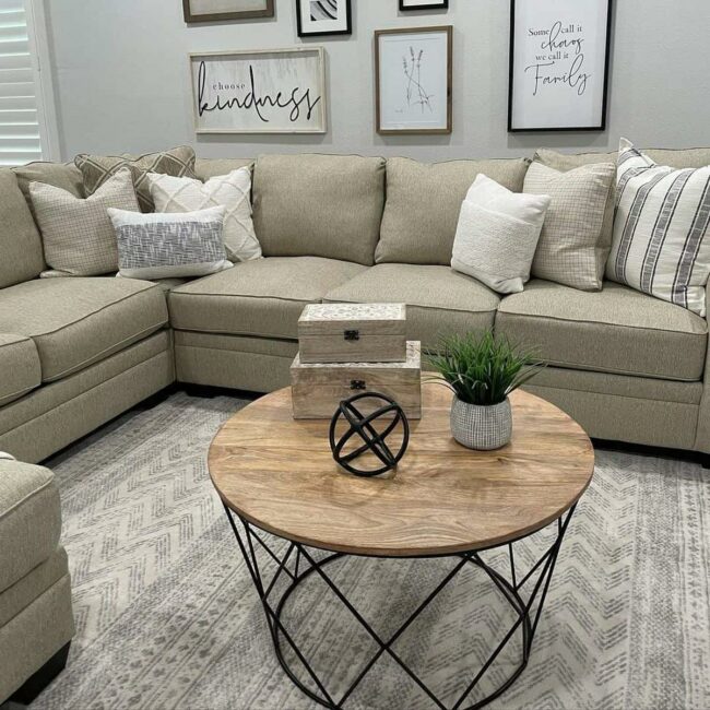 Rustic wood coffee tables complement neutral color palettes, adding character and depth to relaxed room designs.