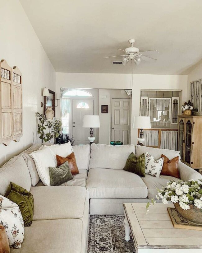 Warm spaces welcome you with subtle charm, drawing attention to an off-white sectional that anchors the room's relaxed energy.