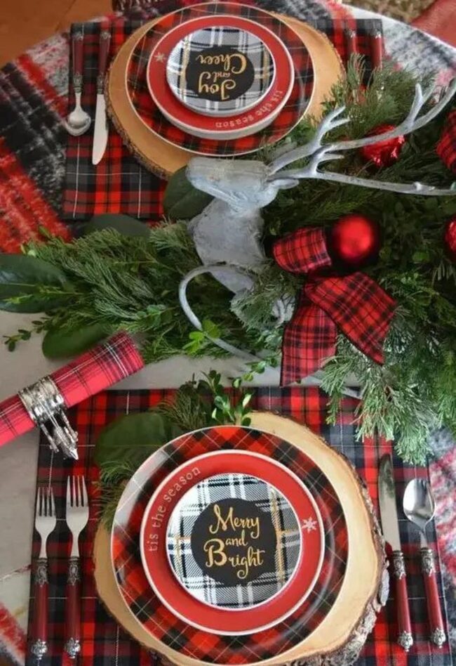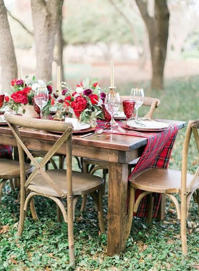 Crisp white plates get dressed up with cozy plaid napkins that feel like a warm embrace from nature.