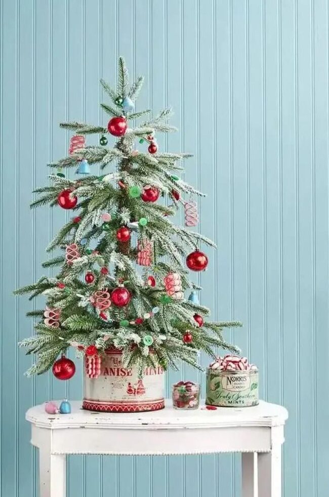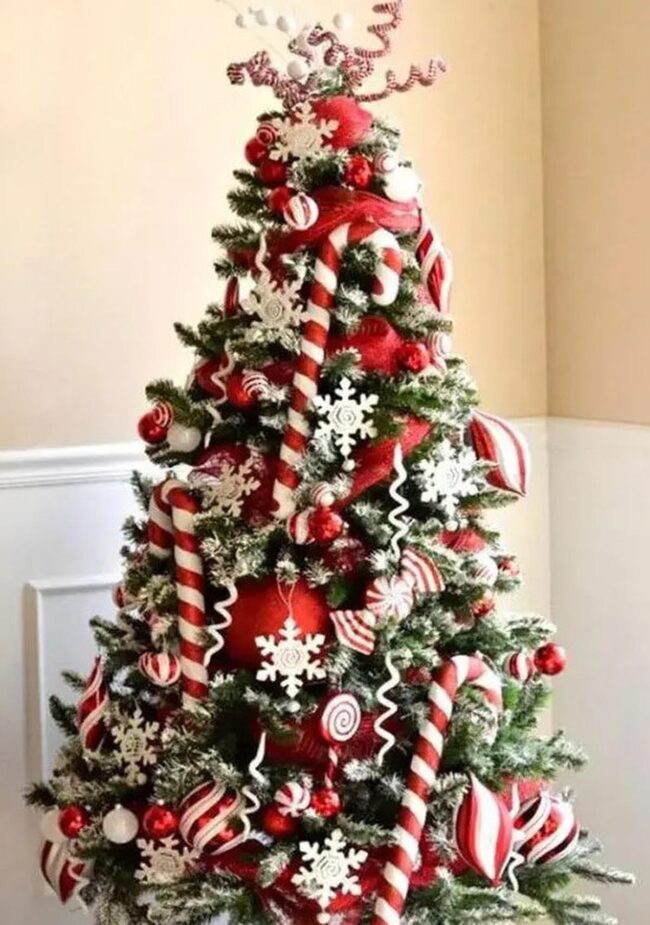 Delightful red and white ornaments dance across evergreen limbs, catching light and drawing curious eyes toward their playful arrangement.