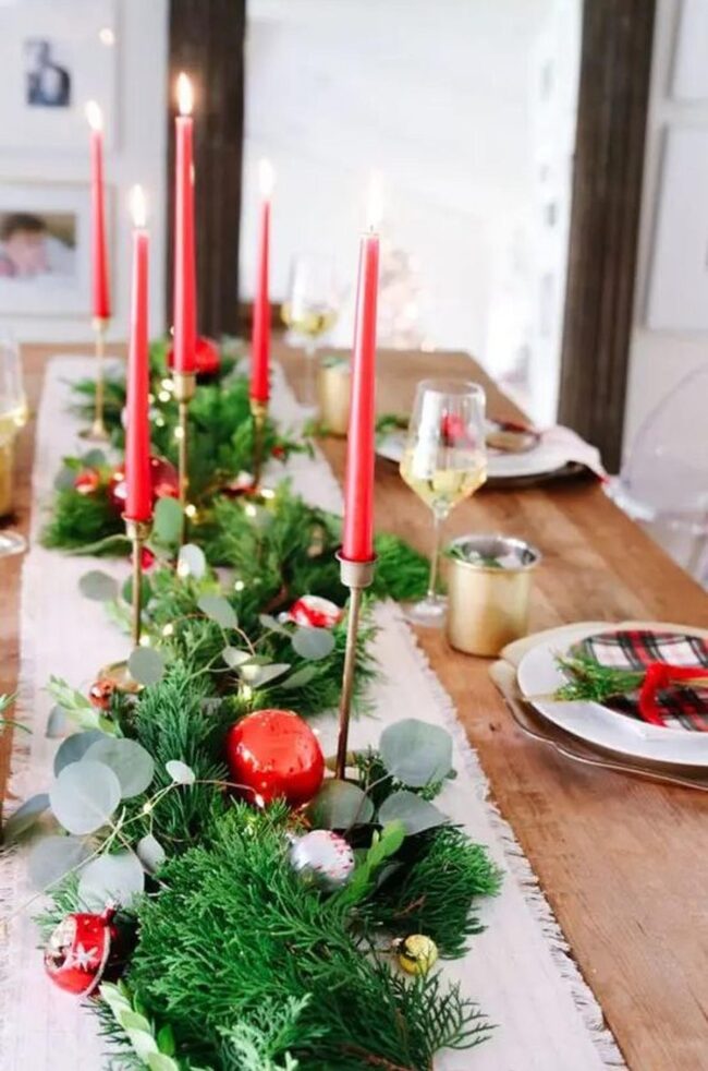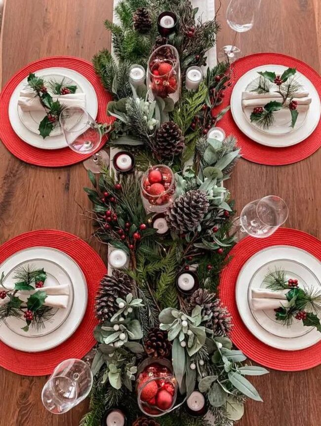 Traditional ornaments in ruby tones pair beautifully with greenery and metallic accents throughout any space.