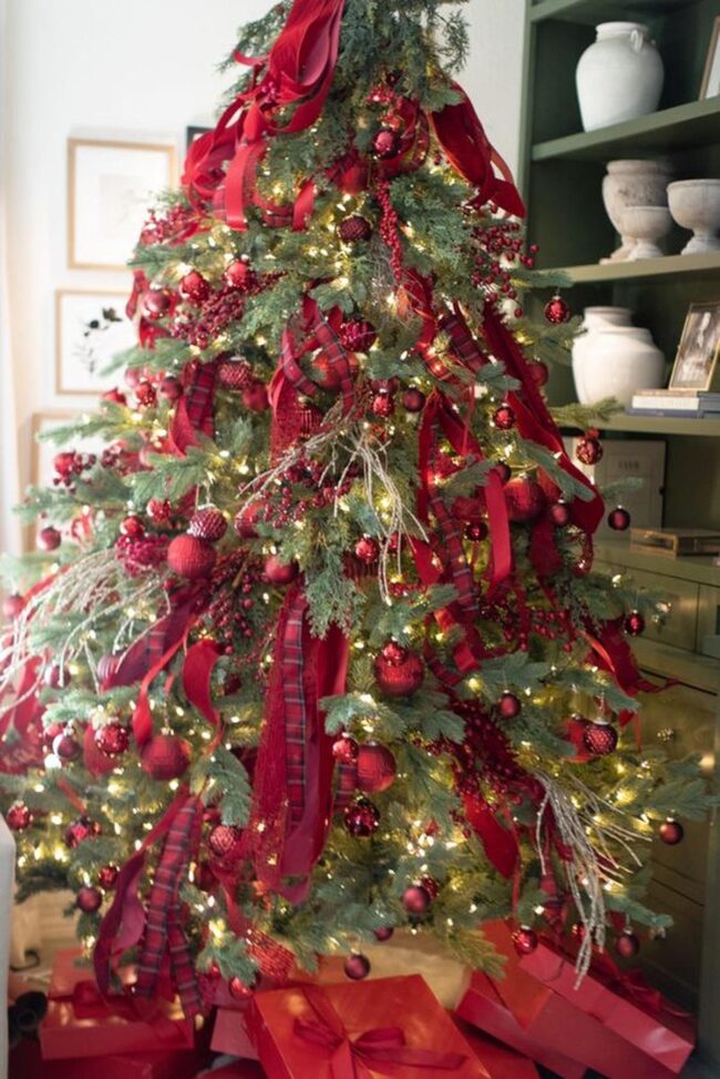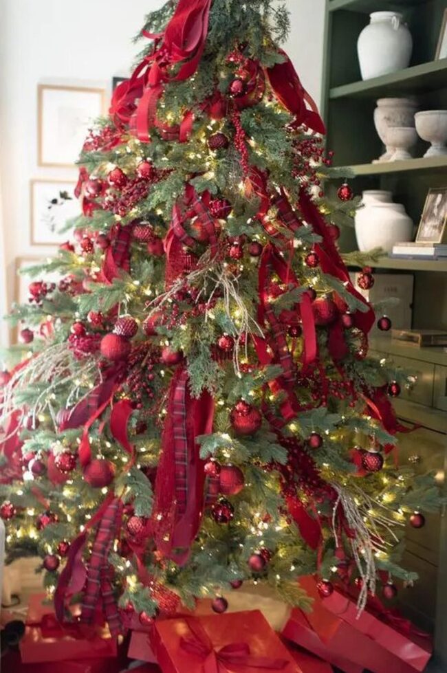 Classic red ribbons and ornaments pop against the evergreen backdrop, creating a stunning visual symphony.