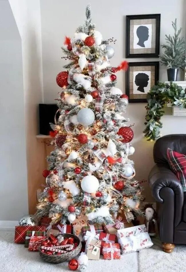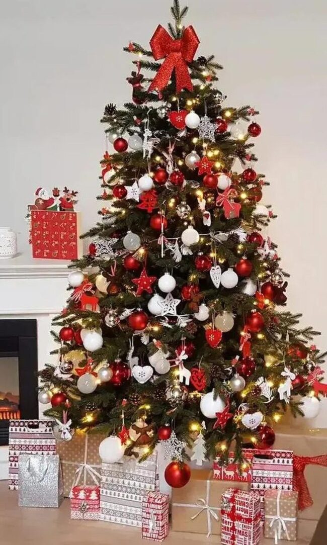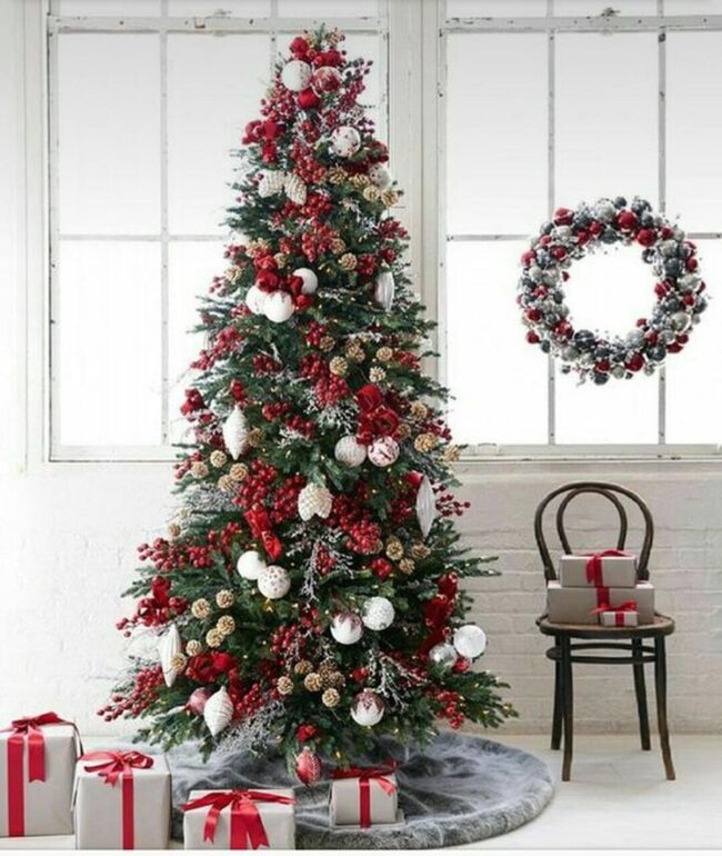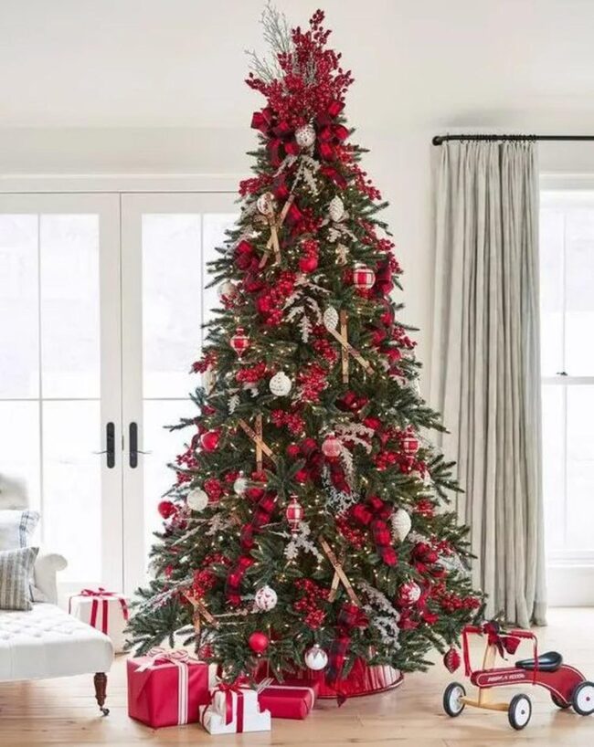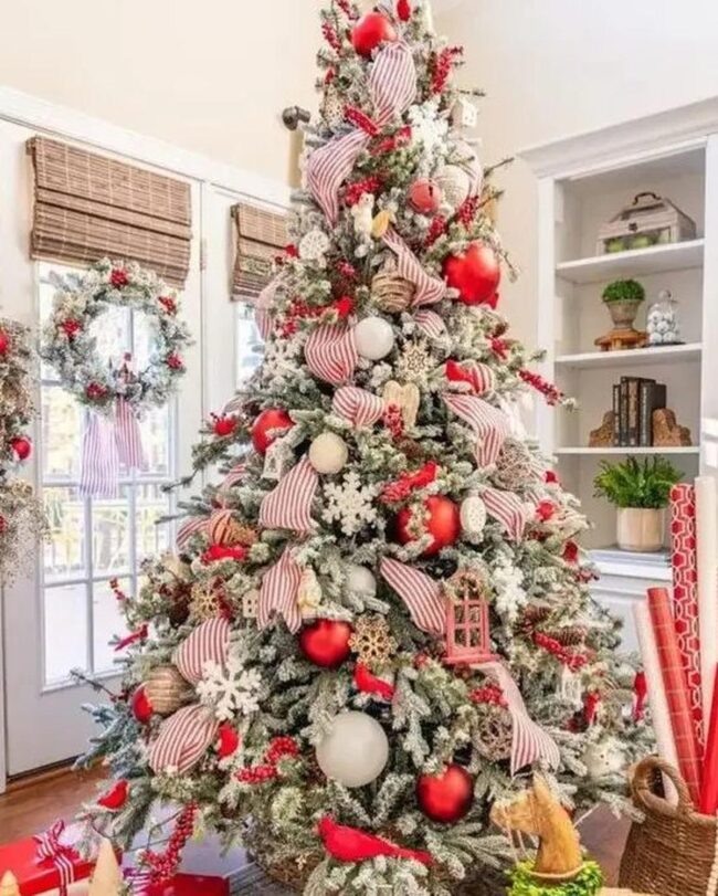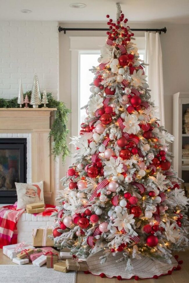 Christmas trees become stunning centerpieces when decorated with classic red and white ornaments that cascade beautifully across lush green branches.